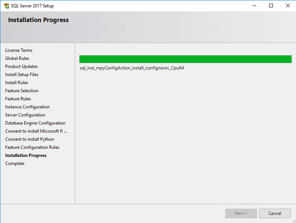 Installationsprozess gegen Ende der Installation SQL-Server 2017 sql_inst_mpyConfigAction_upgrade_configonrc_Cpu64Bei der Installation eines SQL Server 2017 hängt die Installation im letzten Stepp Setup sql_inst_mpyConfigAction_upgrade_configonrc_Cpu64. Das ist eigentlich kein Hang, das Setup dauert nur etwas länger. Der Grund dafür ist, dass die Komponente Python, falls ausgewählt, heruntergeladen und installiert werden muss.